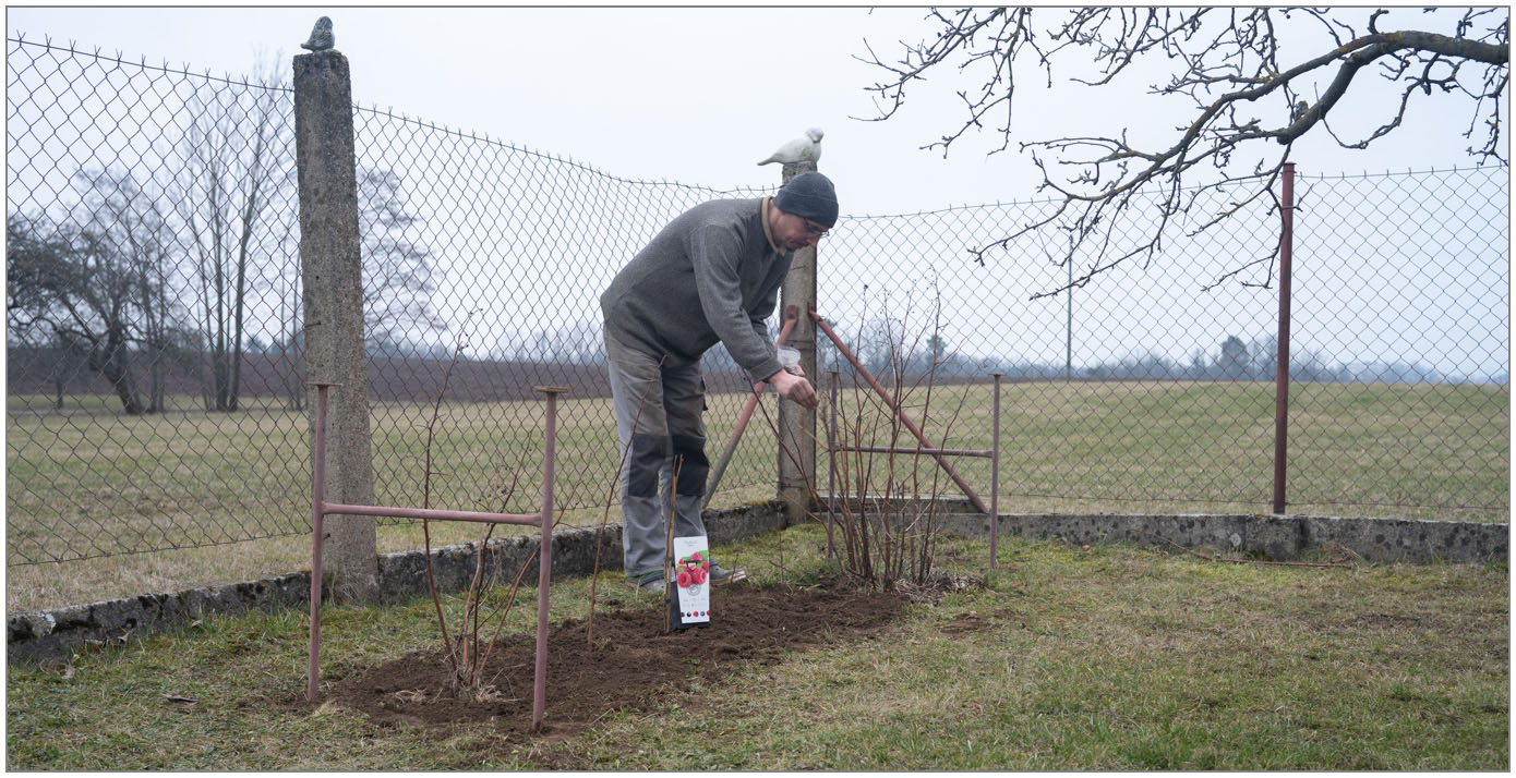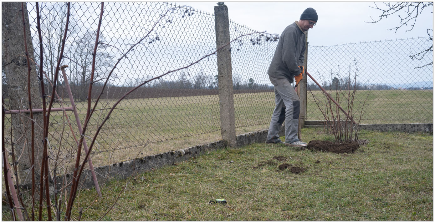 Dopoledne jsem strávil ve chlívě opravou zdi, ale jelikož jsem si koupil maltu od webera 1mm místo na lícové zdivo a začala se do mne dávat zima, tak jsem se odpoledne přesunul na sad a dal jsem se do maliniště. Máme tu jeden pěkně plodící keřík, já dokoupil ve Vamberku další rostlinku a ještě jsem přesunul z úplného rohu další (asi) maliník (má jemné trny).