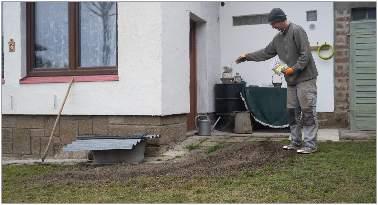 A jelikož začíná poprchávat tak osévám parkovou směsí i kousek kam jsem vyvezl hlínu vykopanou od kompostu. Snad se tu teď chytne tráva.