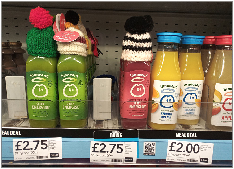 V obchodě se nám objevily džusíky s kulíšky. Čepice jsou všechny ručně pletené dobrovolníky a z každé prodané flašky jde 30 pencí, tedy více jak 10% z ceny, na podporu seniorů. Celkem jich letos lidé upletlyi 1,3 milionu.