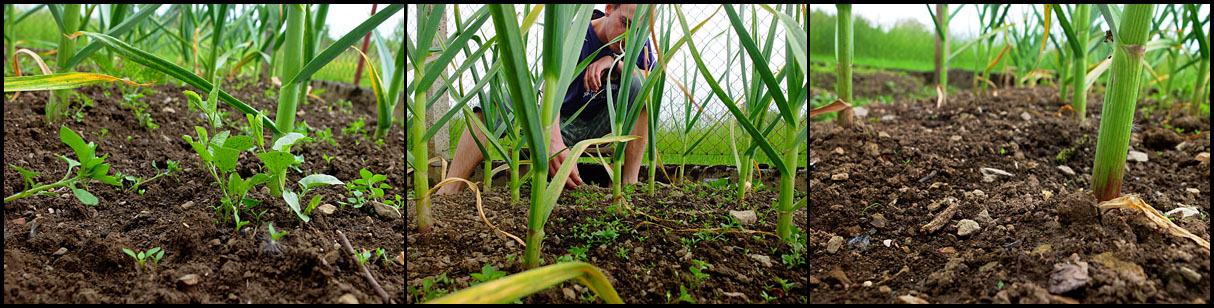 Činnost, ze které jsem už tak odvázanej nebyl, bylo pletí. Bylo mi nadhozeno, že zkulturnit potřebuje záhonek s česnekem. Ony teda ostatní nevypadaly o moc lépe, ale u česneku bylo riziko vytrhání neplevelu minimální, takže se to dalo svěřit i mně 🙂 První záhonek byl takový zajížděcí a u třetího mne to začalo i bavit. Dokonce se mi zdálo, že pleju rychleji a rychleji, i když stále asi pomalu. Stejně jako sečení, i plení jsem měl rozdělené na tři dny a i tady byl výsledek vidět. Jen se mi zdálo, že bych po dokončení posledního, mohl opět začít na prvním…