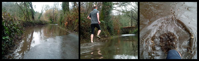 Vybíhám z Lustleighu po dešti, už jen za jemného mrholení a po necelých dvouch kilometrech mne čeká brodění se přes silnici. Do doběhnutí mne už takováto místa čekají jen dvě.