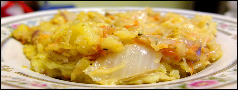 Aby to bylo trochu barevnější, tak jsem k původnímu receptu přihodil nahrubo nastrouhanou mrkev a pro chuť trochu česneku. Jednalo se o nějaké tradiční irské jídlo, takže zelí asi mělo být normální, já doma našel jen to čínské. Potom co se vše podusilo jsem přidal i půlku sáčku nakládaného zelí, klidně by to ale sneslo balení celé.