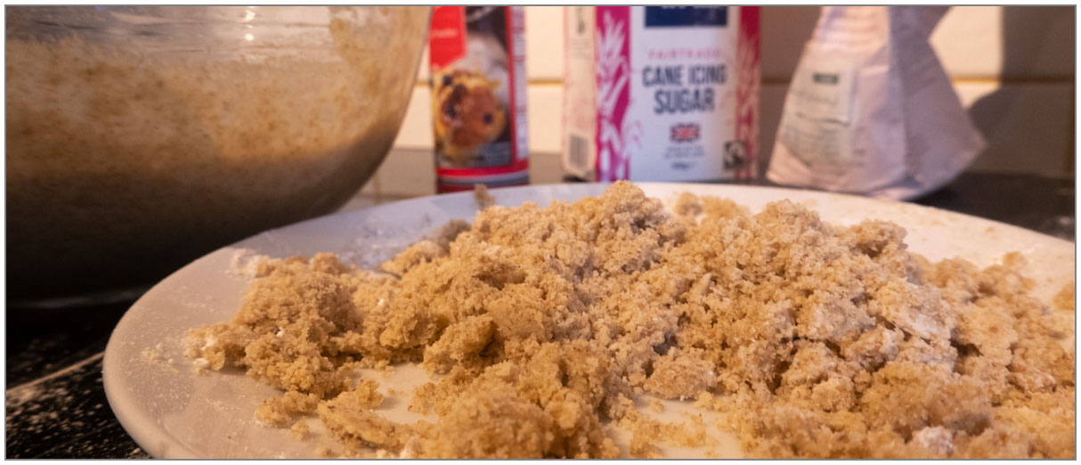 Tyto tři suroviny jsem promíchal a půlku hrnku oddělil na posypku. Do směsi dále následovala