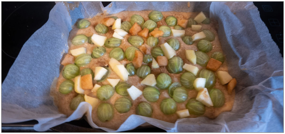 Po vylití na plech jsem na těsto naházel srstky, jablko a trochu skořice a cukru. U srstek jsem si nebyl jistý, jestli je mám dávat celé nebo je půlit, ale jelikož mne honil čas, tak jsem jich rozřízl jen pár. Bál jsem se, že by v troubě mohly vyprskávat, což se ale nestalo, takže příště žádné půlení.