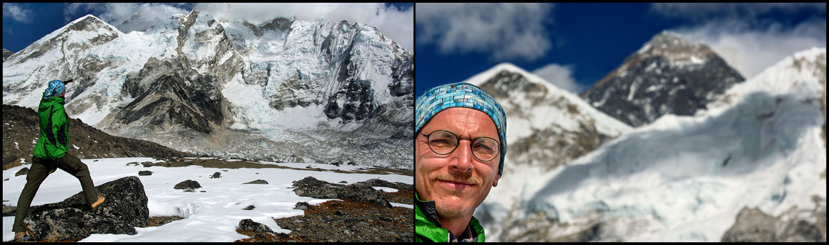 Tím, že jsem se pro výstup rozhodl až po několika minutách chůze, tak jsem se ani neobtěžoval hledat oficiální cestu a dal jsem se raději svahem přímo nahoru. Moc dlouho netrvalo a dával jsem si dlouhou pauzu. Ne že bych se vyčerpáním nemohl hýbat, ale tím, jak jsem nabíral výšku, tak za mnou, zpoza masivu Nuptse, začal vyrůstat Everest. Našel jsem si místo v závětří na sluníčku a jen jsem se kochal. Času jsem měl dost, takže žádné stresy.