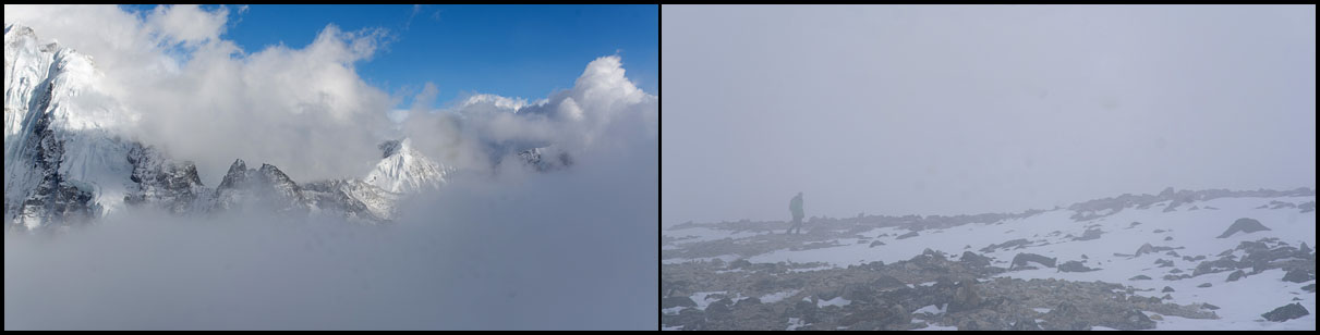 Oproti včerejšku nad Chhukhungem, je toto pěkná špička a ne plošina, musím si teda dávat i trochu pozor, abych se nezřítil, severozápadní strana je totiž dost strmá. Kromě vlaječek je tu i stožár s malou meterologickou stanicí a web kamerou, která je namířená na Everest. Kupodivu nikde ani noha, což požitek z výhledu ještě zvětšuje. Důvodem, proč se sem nikdo nevydává musí být oblačnost pode mnou. Z údolí to musí vypadat, že výhled nebude stát za to.