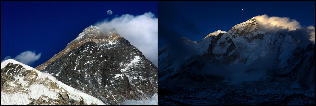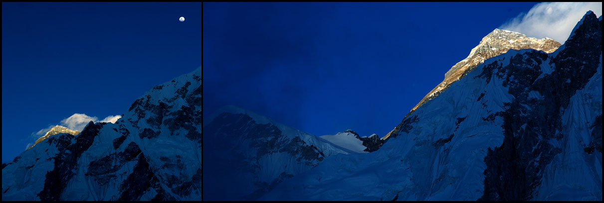 Jak se vypařil důvod spěchat, tak jsem se opět posadil a navázal na předchozí kochání se. Když jsem se otočil zpátky k vrcholu, tak jsem civěl na monumentální Pumo Ri, která na mne působila mnohem dominantněji, než Everest naproti. Ten dost schazovala vizuálně mnohem vyšší Nuptse. Postupem času, jak se začínalo šeřit a vyšel Měsíc, ale přišel důkaz, kdo je tady králem.