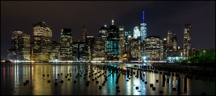 Manhattan jsem si nejdříve z Brooklynu vyfotil z kopečku a pak přešel po osvětleném molu mezi domy až k řece.