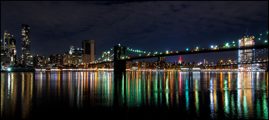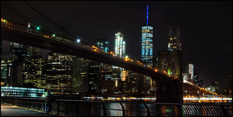 Po Brooklynském mostě jsem posléze přešel zpátky na Manhattan. I když byla jedna v noci, tak tu stále jezdila auta. Samotná pěší část vedla uprostřed a při každém projíždějícím autě rezonovala, což komplikovalo focení s dlouhým časem. Samotná konstrukce byla naštěstí pevná, ale cokoli navěšené na ní opět rezonovalo. Metro tu naštěstí jezdí i v noci, takže jsem ho mohl, po přejití mostu, použít k přiblížení se k hotelu.