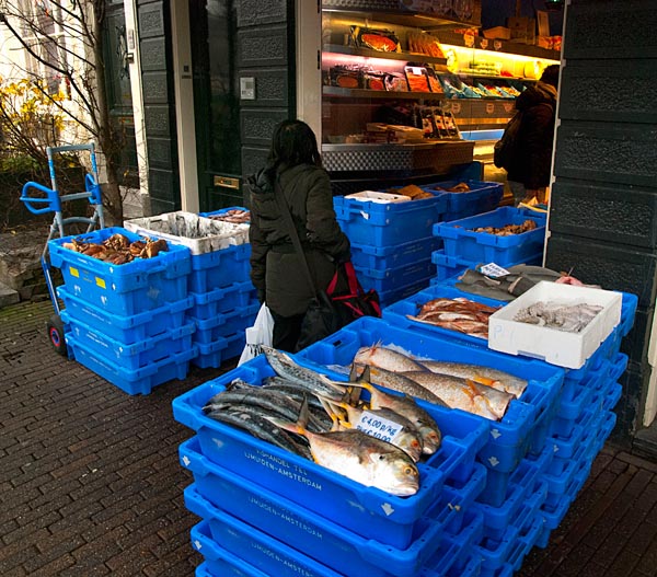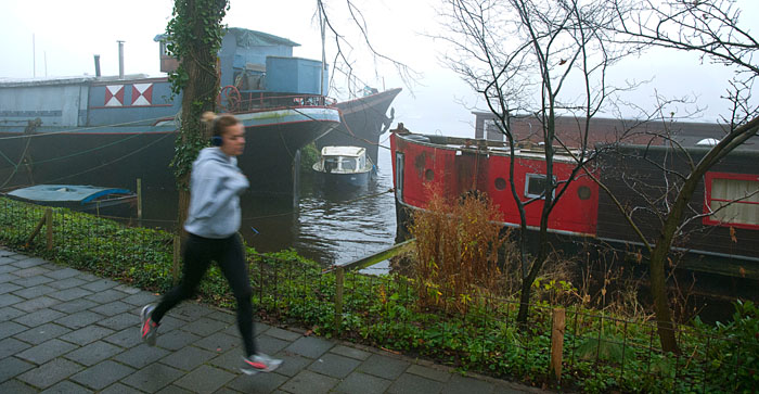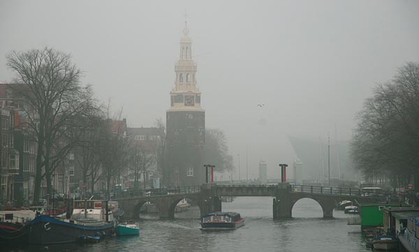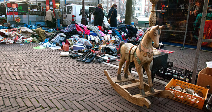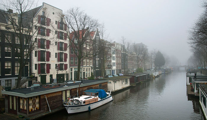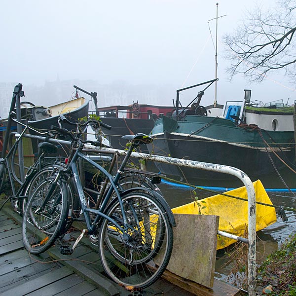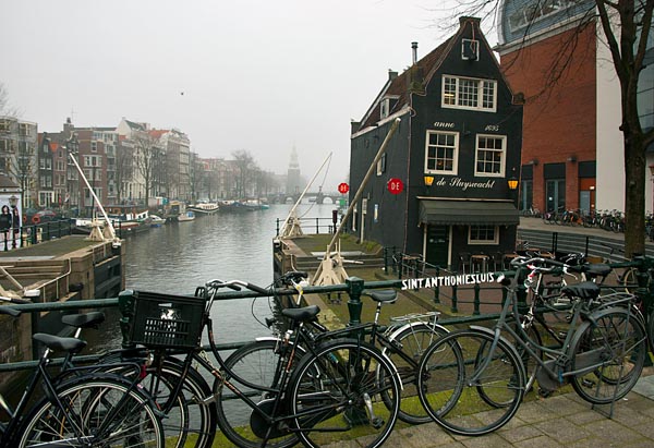 Včera i předevčírem tu bylo slunečno, ale na dnešek bohužel vyšla mlha. Já jsem od nádraží Amstel zamířil podél řeky do centra. I když bylo po deváté ranní, tak všude pěkné ticho. Občas nějaký běžec a hafo kol. Rušná silnice byla o dva bloky dál, ale hluk sem vůbec nedoléhal. To je jeden z hlavních vjemů, který si odtud odnáším – tiché město. Druhým pak byla spousta starších (antik) věcí ke koupi ať už u stánků a nebo v obchodech.