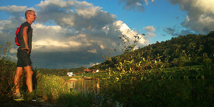Podle mapy jsem měl vybraný místo u Klecánského přívozu. Trasu jsem už znal. V Ďáblicích jsem se napojil na žlutou a pokračoval podél skládky do Zdib. V Přemýšlení míjím žltou odbočku a pokračuji po své zelené naučené trase, která je o kilometr delší. Když dobíhám k Vltavě, tak mi na hodinkách svítí 11,5km. Koukám, že převozník převáží a tak se vydávám na druhou stranu. Při břehu je všude vysoká tráva, přístup k vodě tedy nic moc. Pak zjišťuji, že běžím podél ostrova a tak pokračuji až k jeho konci a kousek za ním už nacházím kamenitý vlez do vody.