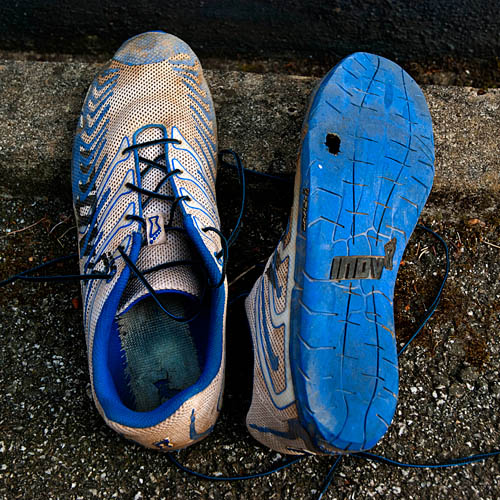 Prstovou část mají širší než Inovejty, řekl bych že jsou stejně široké jako Viva. Svršek je z nylonu a na dotyk je tak nějak zvláštně měkký, jakoby houbový, přitom ale dost tenký. Asi z důvodu ochrany před roztržením jsou přes něj vedeny plastové (jakoby izolepové) proužky. Podrážka je oproti mým předešlým botám tužší, zdá se mi ale ohebnější než u vrácených Merrelek. Zaplatil jsem za ně 47 liber, tedy necelých pátnáctset.