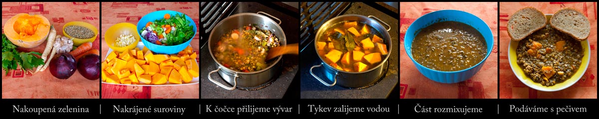 Přivedeme k varu, necháme dusit a vrhneme se na tykev, ta by měla mít přes půl kila (600g). Já ji oloupal (ořezal) a nakrájel na větší kousky. Více druhů tykví či dýní nám prý dodá rozmanitější chuť a já nemám důvod tomuto nevěřit. Jakmile máme nakrájeno, přihodíme kousky do hrnce a přilijeme tolik vody, aby vše bylo pod hladinou. Přiklopíme a necháme bublat 40minut. Já to nechal vždy asi trochu déle, beztak mám radši rozbředlé než tvrdé a čočce to asi taky jen prospělo.