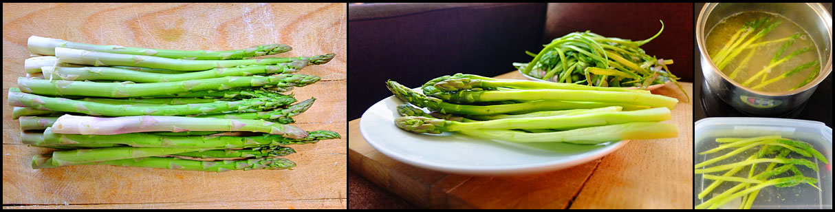Zelený chřest prý není vždy nutné loupat, já ale raději neponechal nic náhodě, čímž se tenké stonky proměnily téměř v nudličky. Ještě před tím jsem odlomil konce. Nejčastěji jsem četl, že se má spodní třetina odkrojit, mne se ale více líbil odlamovací styl. Teorie za ním je taková, že se stvol pod tlakem zlomí právě v tom místě, kde je třeba, což mi přišlo lepší. Po této přípravě následovalo blanšírování, což zní jako něco extra, ale je to vlastně jen krátké povaření (2minuty) a prudké zchlazení (ledová voda). Do 600ml osolené vroucí vody se 100ml bílého vína jsem chřest dával po částech, což prý udělá silnější vývar. Na závěr jsem na půl minuty povařil odpad, který pak putoval do kompostu.